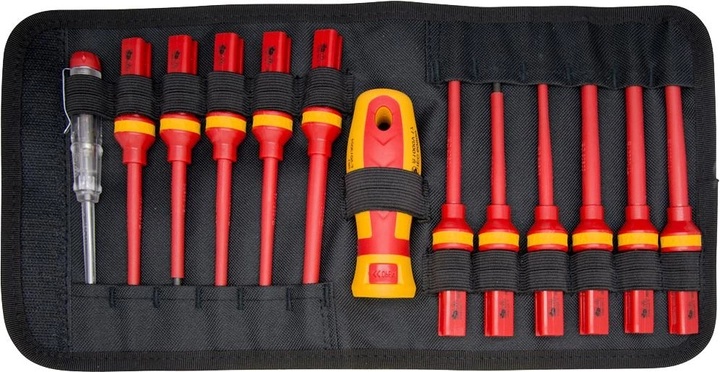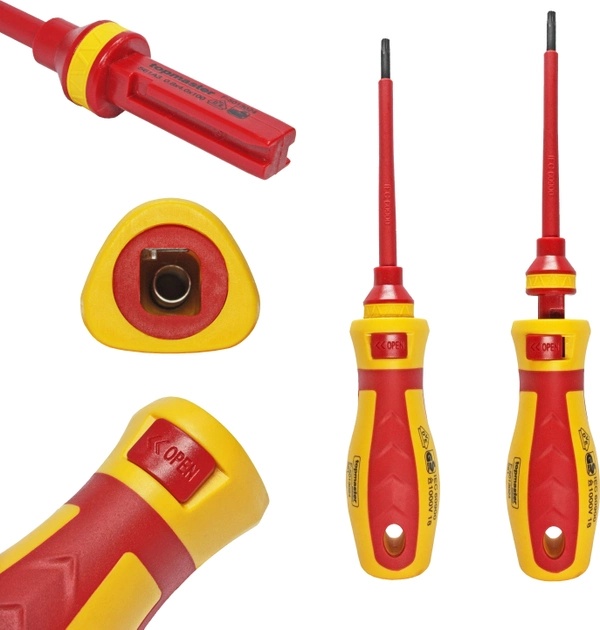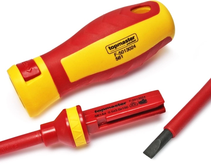 Держатель бит Topmaster — профессиональный инструмент. Набор включает надежный диэлектрический держатель, тестер и комплект магнитных диэлектрический бит с Cr-V стали.