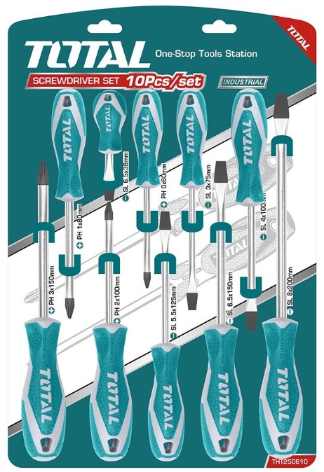 Отвертки набор 10шт. ТНТ250610 — набор из 10 отверток из стали CR-V, используемых для профессиональных сборочных работ в различных отраслях промышленности.