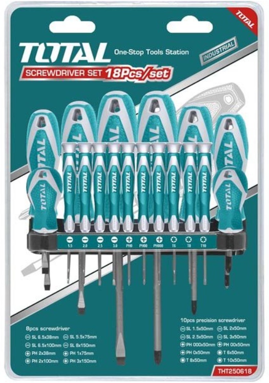 Набор отверток 18 шт. TOTAL THT250618 — большой универсальный комплект, который подходит для разного вида работ. В наборе 4 отвертки для обслуживания крепежа с прямым шлицем, 4 отвертки — с крестовым шлицем и 10 миниатюрных отверток для точных работ с прямым, крестообразным и TORX шлицем. Стержни инструментов выполнены из хромванадиевой стали, не боятся коррозии и деформации. Удобные ручки изготовлены из нескользящих материалов и оснащены отверстиями для подвешивания.