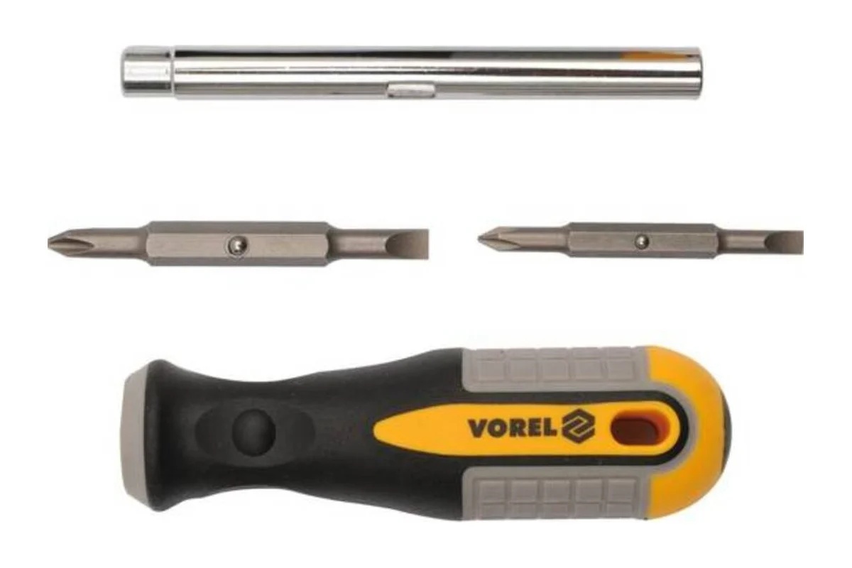 Двухсторонняя отвертка со сменными вставками VOREL 64654 поставляется в разобранном виде.