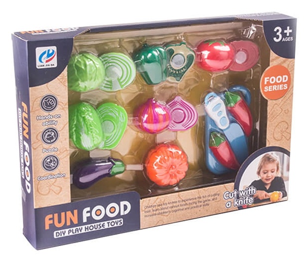В наборе есть нож и доска для нарезания. Овощи разделены на половинки и держатся на липучках. Их можно нарезать ножом.