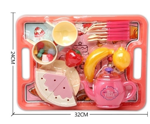 Очаровательный и интерактивный набор, включающий в себя красиво украшенное блюдо, полный чайный сервиз, игрушечный торт и набор красочных фруктов, все выполнено с привлекательными деталями.
