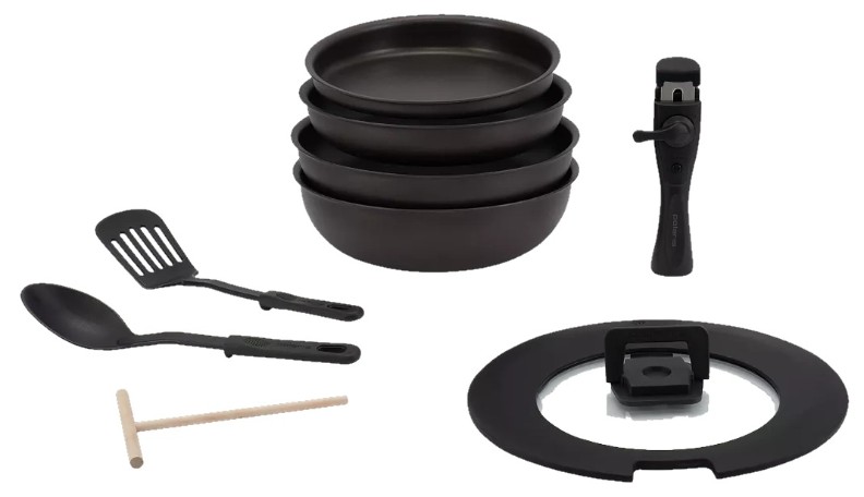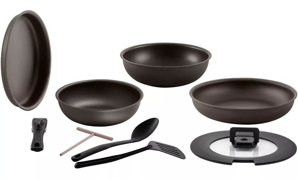 Особенностисиликоновая крышка 24-26 см, распределитель теста, кулинарная ложка, кулинарная лопатка, съемная ручка