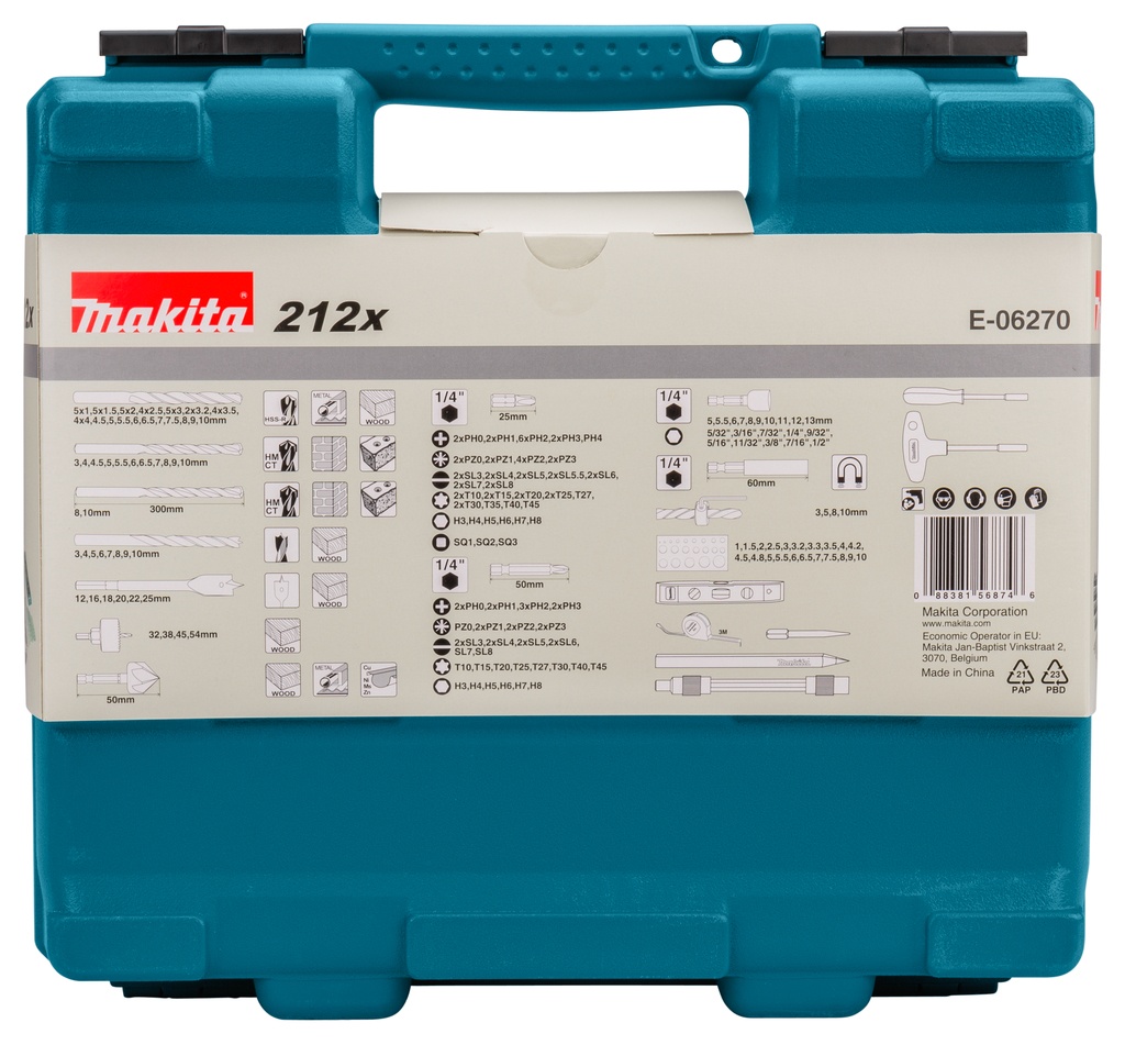 Комплект инструмента Макита Е-06270 является универсальным, ведь в его состав входят различные инструменты, позволяющие выполнять огромное количество работ в мастерской, на строительной площадке и в быту. Применяется совместно с дрелями и шуруповертами для сверления отверстий в различных материалах, а также для монтажа или демонтажа различных крепежных элементов.