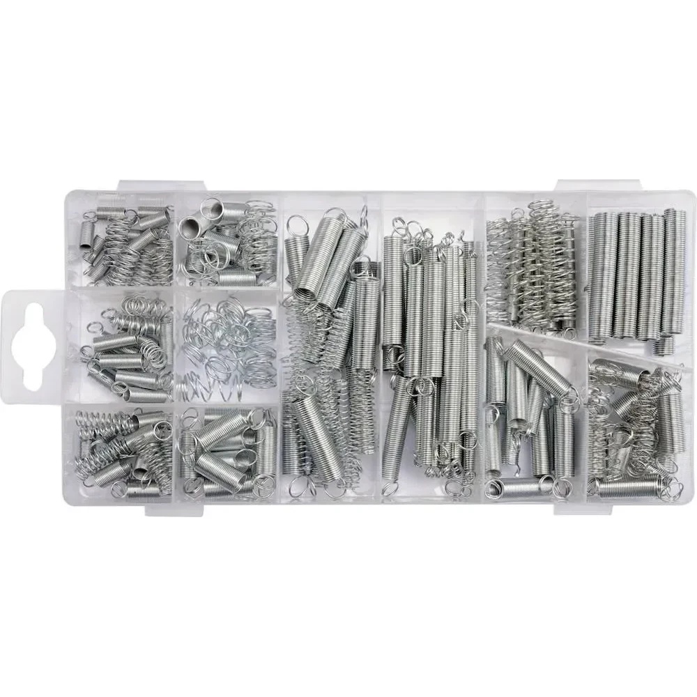 Материал: железо. Поверхность: оцинкованная. Комплектация: пружинки x200 (4x79,5 мм x12, 4,5x44,5 мм x8, 5x20,5 мм x10, 5,5x17,5 мм x10, 5,5x25,5 мм x10, 5,5x38 мм x10, 6,5x10 мм x10, 6,5x22 мм x10, 7x12,5 мм x10, 7x19 мм x10, 7x38 мм x10, 7x51 мм). Количество штук в наборе: 200.