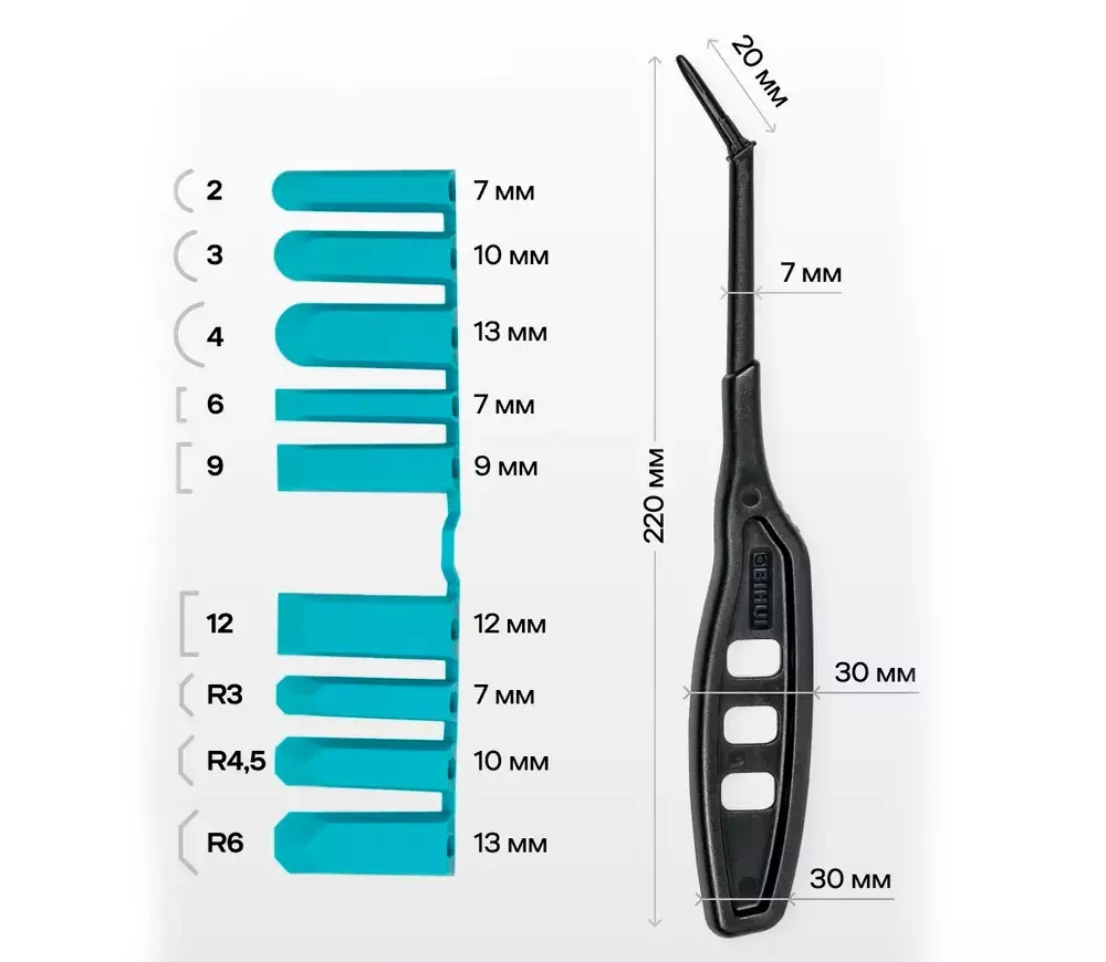 Шпатели для силикона BIHUI – это профессиональный инструмент для идеальных силиконовых швов. Применяется для точного выравнивания и формирования красивых швов в процессе строительных работ. Насадки, выполненные из прочного термопластика, обладают идеальной формой, которая позволяет создавать однородные швы независимо от давления на ручку. Шпатель также оборудован удобной и эргономичной ручкой, что делает его использование максимально комфортным и позволяет сделать идеальный шов даже в труднодоступных местах. Сменные насадки позволяют выполнить работы с герметиками и силиконами, а благодаря 9 различным профилям быстро и легко выбрать желаемый вид шва.