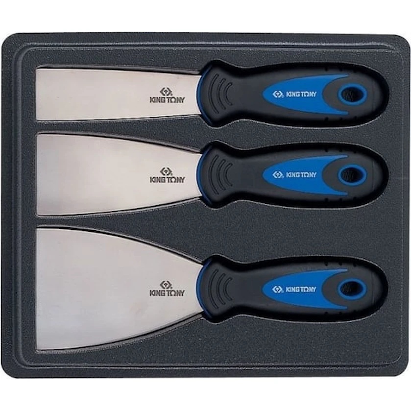 Набор шпателей для кузовных работ 3шт KING TONY 9CJ013 представляет три инструмента различной ширины, которые позволят легко, быстро и профессионально справиться со шпаклевкой кузовных деталей автомобиля при восстановлении вмятин и неровностей. Шпатели оснащены удобными рукоятками из нескользящего двухкомпонентного материала.