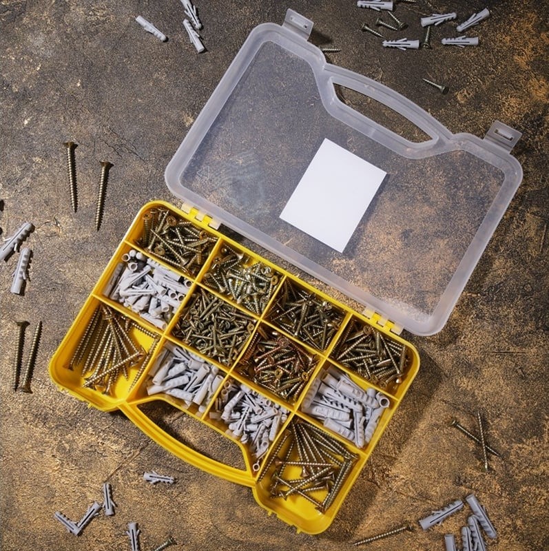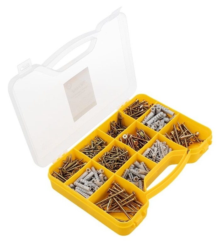 Набор саморезов по дереву и распорных дюбелей позволяет применять крепеж для скрепления как деревянных оснований, так и для крепления ко всем видам полнотелых оснований (бетон, железобетон, кирпич и пр.). При закручивании тело дюбеля расширяется по всему диаметру и длине, что усиливает распорное давление, позволяя выдерживать увеличенные нагрузки.