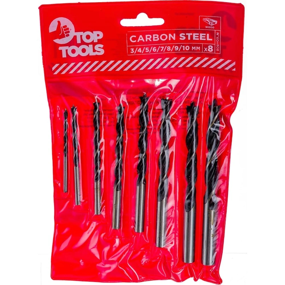 Набор сверл по дереву Top Tools 60H808 предназначен для точного сверления отверстий в древесине и материалах на ее основе, а также в пластмассах. В комплекте поставляются 8 спиральных сверл наиболее востребованных диаметров от 3 до 10 мм, что делает этот набор универсальным решением для различных задач. Благодаря специальной конструкции, сверла не скользят в начале работы, обеспечивая повышенную точность и удобство использования.