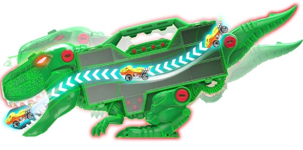 Динозавр может стоять на 3 различных высотах. Все включенные автомобили имеют масштаб примерно 3 дюйма. Характеризуются высококачественными деталями из литьевого металла и независимыми вращающимися колесами.