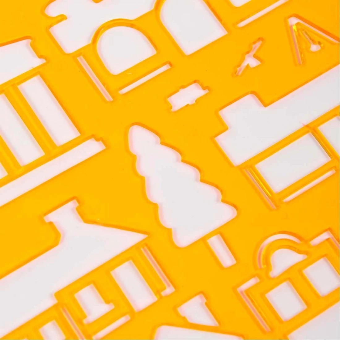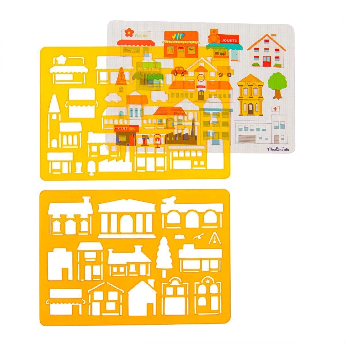Набор из двух трафаретов для рисования, позволяющих легко воспроизвести целый город: дома, музеи, деревья и магазины. Изготовлены из пластика, их можно стирать и использовать бесконечно!