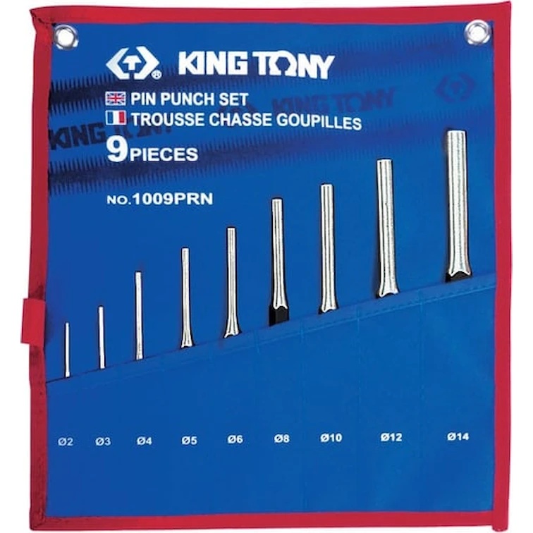 Набор выколоток в чехле из теторона (9 предметов) KING TONY 1009PRN включает в себя оснастку ударного типа диаметром 2, 3, 4, 5, 6, 8, 10, 12 и 14 мм. Сфера применения набора - изготовление отверстий, извлечение сломанного и ржавого крепежа.