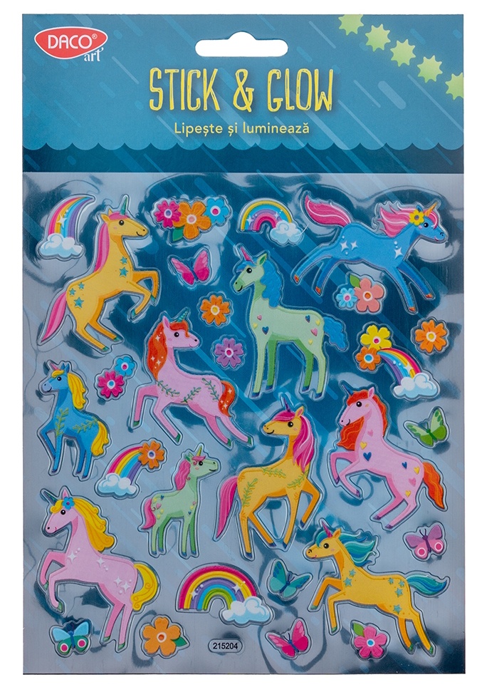 Окунитесь в волшебный мир с наклейками Unicorn «Stick and Glow in Color» от DACOart. Эти фосфоресцирующие наклейки ярких цветов добавят очарования и блеска вашим любимым предметам, превратив любую поверхность в волшебную страну.