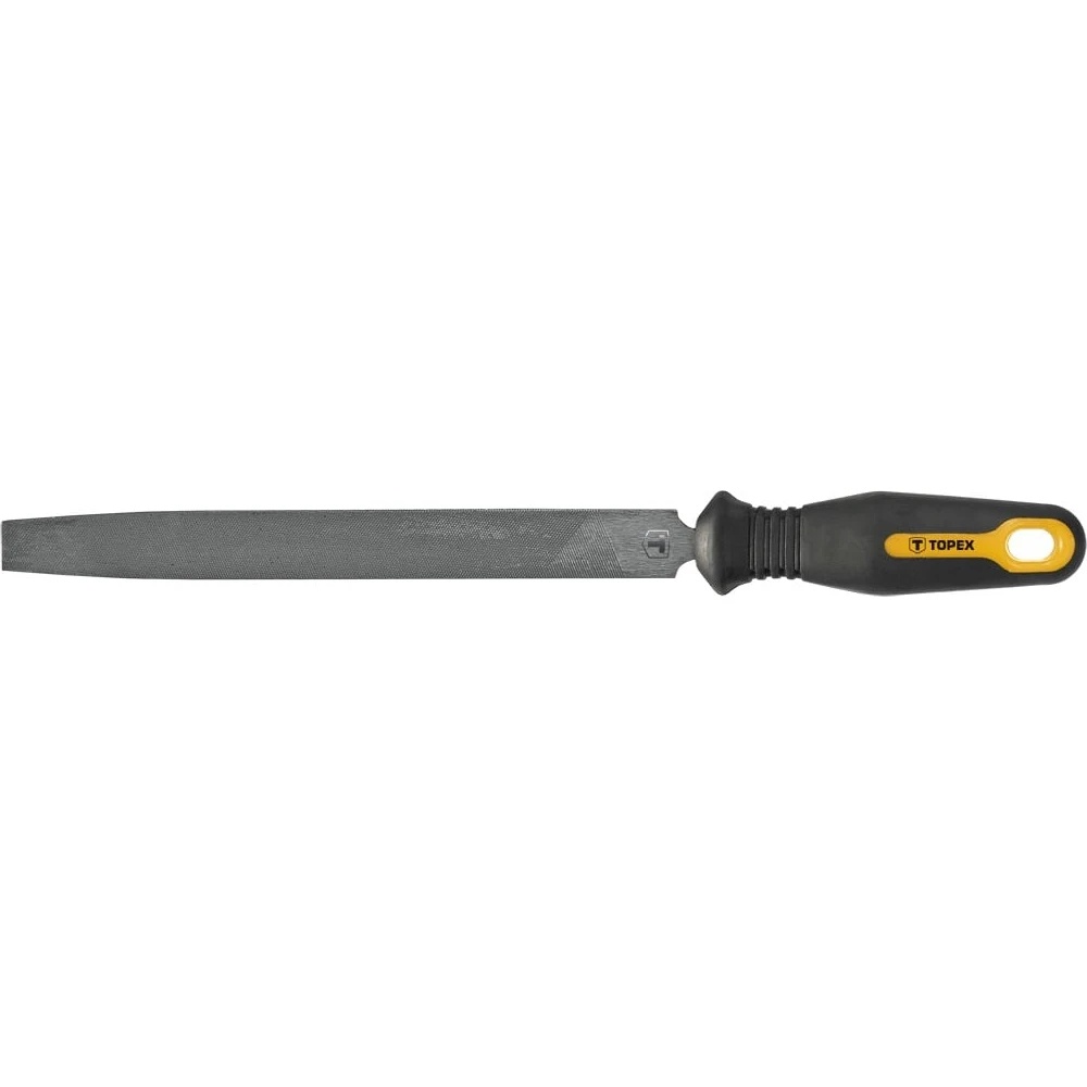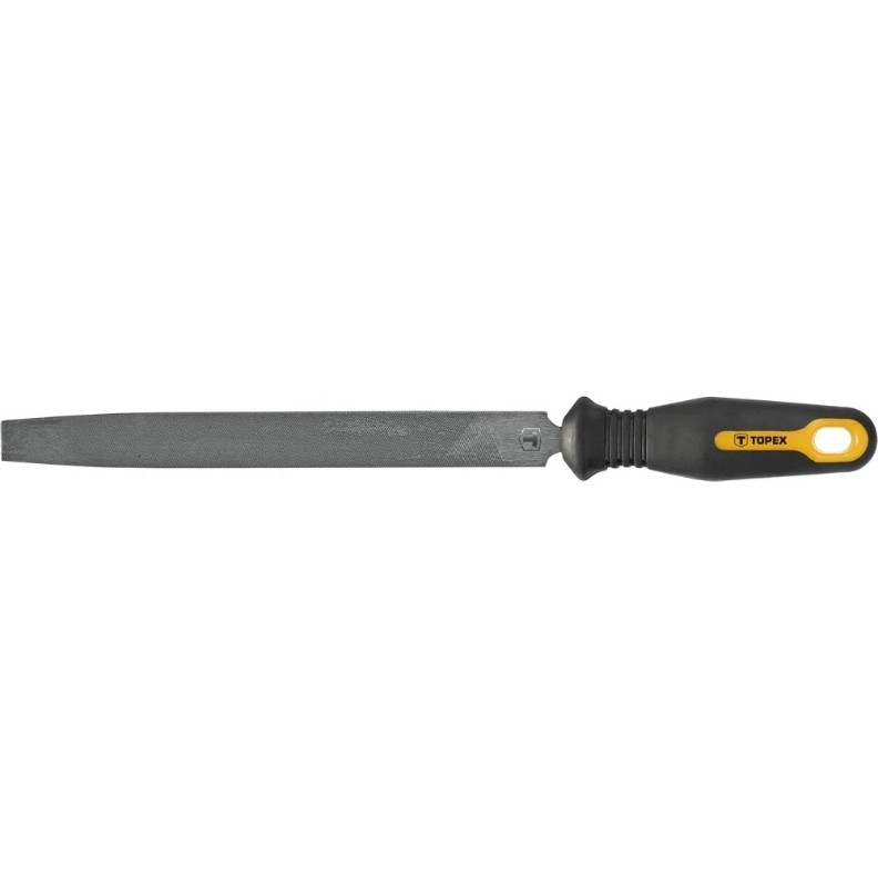 Напильник по металлу TOPEX 06A721 используется для шлифования металла. Он имеет плоский профиль, который позволяет эффективно обрабатывать прямые поверхности и пазы. Стержень напильника изготовлен из высококачественной стали Т12, что гарантирует его прочность и долговечность. Рукоятка покрыта антискользящим материалом, обеспечивая надежный хват.