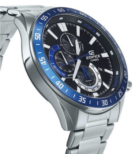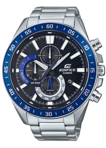 Свежий релиз второй половины 2021 года в коллекции Edifice — крупный хронограф из серии EFV-620 в стальном корпусе на стальном браслете. Черный динамичный циферблат часов с синими деталями защищен прочным минеральным стеклом и стальным безелем, а водозащита в 10 Бар позволяет пользоваться часами в любых погодных условиях. Модель обладает секундомером на 60 минут с шагом измерения в одну десятую секунды, а у отметки в 4 часа расположилось окошко текущей даты. Отдельно отметим крупный корпус часов — больше 50 мм и по высоте, и по ширине.