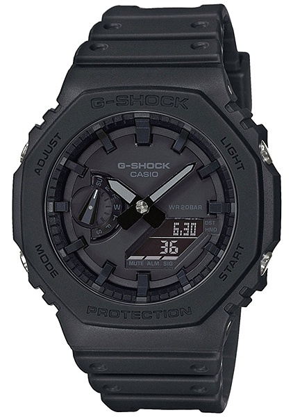 Перед вами огненный релиз 2019 года в новом корпусе GA-2100 с безелем в форме октагона. Модель отличается среди других джишоков своей легкостью, компактностью и толщиной корпуса всего в 11.8 мм! Это стало возможным благодаря технологии Carbon Core Guard: модуль часов защищает легкий и сверх-прочный полиуретановый корпус с углеродным армированием, а циферблат покрыт закаленным минеральным стеклом. Часы выполнены в лаконичной черной стелс-расцветке, а контрастные серые стрелки, на фоне циферблата с инверсионными дисплеями, обеспечивают высокую эргономику при пользовании часами. Еще одна особенность часов — обновленное крепление ремешка, теперь его смена займет у вас всего несколько секунд. Конечно же, не стоит забывать про стандартную для джишоков водозащиту в 200 метров, функции секундомера, таймера, мирового времени, удобную функцию складывания стрелок для считывания информации с дисплеев, а также яркую двойную подсветку циферблата и дисплея.