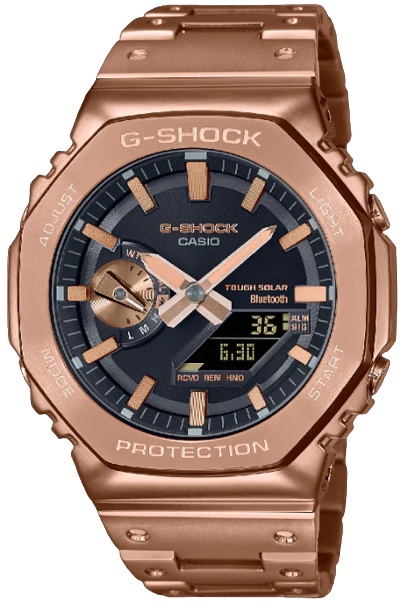 Перед вами яркий релиз второй половины 2022 года, новая серия G-Shock GM-B2100 в полностью стальном корпусе в форме октагона! Это старший брат популярной полимерной октагоновой серии GA-2100 и мидл-серии GM-2100, которая имеет стальную верхнюю часть корпуса и полимерный ремешок. В отличие от своих младших собратьев, данная модель имеет полностью стальной корпус с IP покрытием цвета розового золота и литой браслет, что добавляет ей увесистости (165 грамм со всеми звеньями) и совершенно иную тактильность на вашем запястье. Отдельно стоит отметить технологичность модели: в часах доступна синхронизация времени со смартфоном и легкая настройка часов через Bluetooth, а также улучшенная и еще более эффективная технология Tough Solar — питание часов от солнечного или иного источника света, что не потребует замены батарейки в часах в ближайшее десятилетие. Дизайнеры Casio дополнительно проработали и циферблат новинки. С виду он почти не отличается от серий GA-2100 и GM-2100, однако на деле он стал более глубоким, многослойным и фактурным, что добавляет визуальной эффектности при виде часов «в живую». Собираются часы в Японии на высоко-технологичном производстве CASIO в Ямагата.
