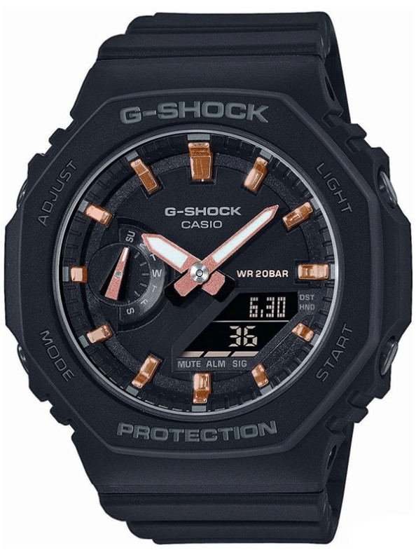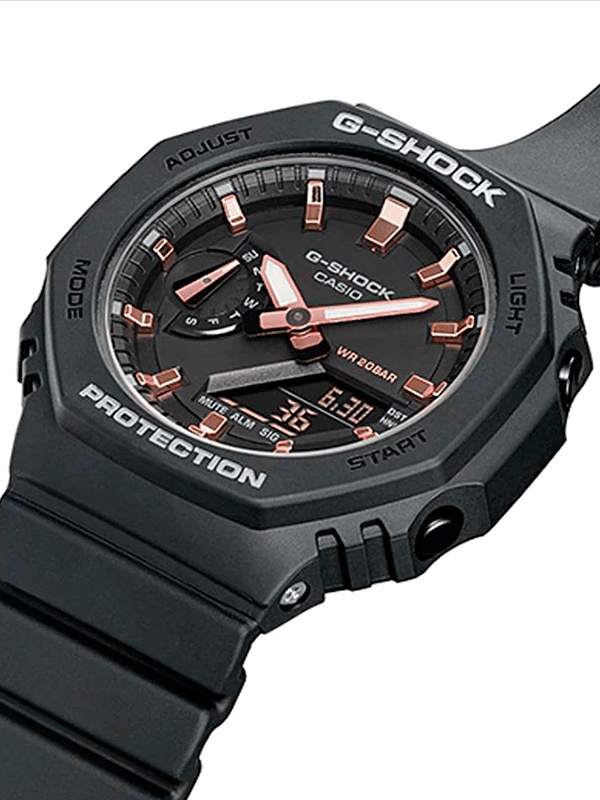 Перед вами стильная унисекс новинка 2021 года из свежей серии G-SHOCK GMA-S2100 в черном корпусе с метками циферблата цвета розового золота. Модель является уменьшенным вариантом часов из мужской серии джишоков GA-2100, что позволяет ей оптимально выглядеть даже на небольших мужских и самых изящных женских запястьях. Толщина модели всего 11.2 миллиметра, что на момент ее выхода является абсолютным рекордом среди всех джишоков! Часы обладают технологией Carbon Core Guard: их модуль защищает легкий и сверх-прочный полиуретановый корпус с углеродным армированием, а циферблат покрыт закаленным минеральным стеклом. Конечно же, не стоит забывать про стандартную для джишоков ударопрочность и водозащиту в 200 метров, функции секундомера, таймера, мирового времени, удобную функцию складывания стрелок для считывания информации с дисплеев, а также яркую двойную подсветку циферблата и дисплея.