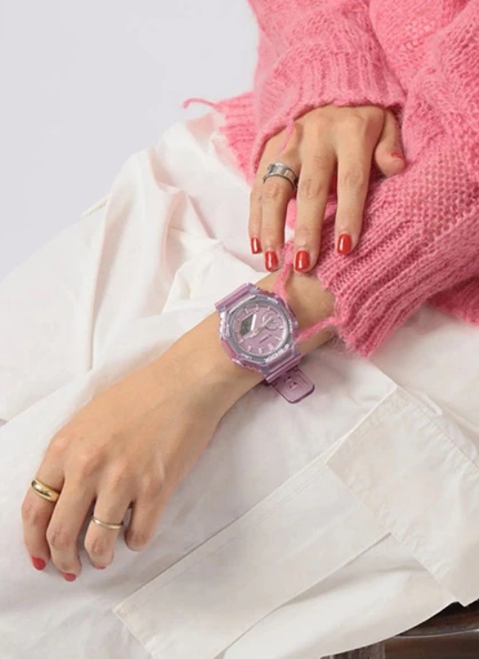 Перед вами стильная женская новинка 2022 года из свежей серии G-SHOCK GMA-S2100 в ярком полупрозрачном розовом корпусе на полимерном ремешке. Модель является уменьшенным вариантом часов из мужской серии джишоков GA-2100, что позволяет ей оптимально выглядеть даже на самых небольших мужских и изящных женских запястьях. Толщина модели всего 11.2 миллиметра, что на момент ее выхода является абсолютным рекордом среди всех джишоков! Часы обладают технологией Carbon Core Guard: их модуль защищает легкий и сверх-прочный полиуретановый корпус с углеродным армированием, а циферблат покрыт закаленным минеральным стеклом. Конечно же, не стоит забывать про стандартную для джишоков ударопрочность и водозащиту в 200 метров, функции секундомера, таймера, мирового времени, удобную функцию складывания стрелок для считывания информации с дисплеев, а также яркую двойную подсветку циферблата и дисплея.