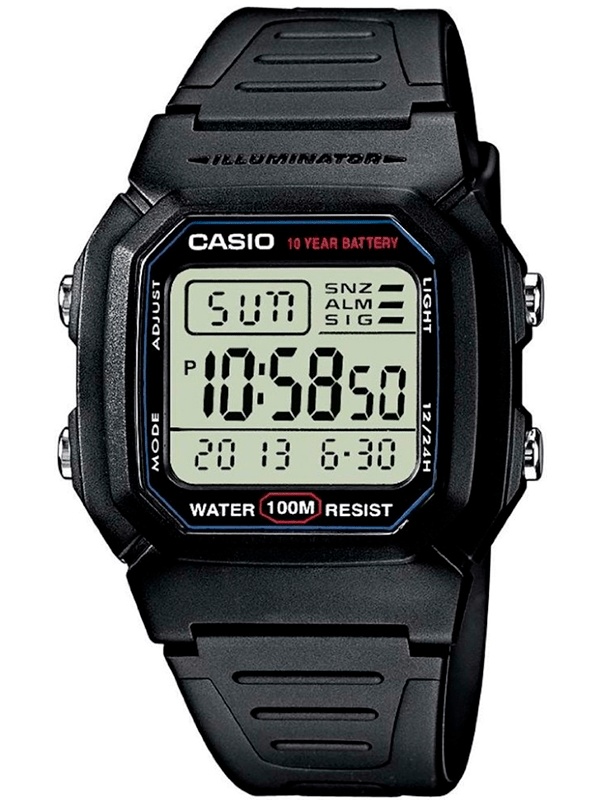 Электронные кварцевые мужские наручные часы Casio W-800H-1A с цифровой индикацией времени. Калибр механизма — 3240. Максимально допустимая погрешность точности хода +30/-30 секунд в месяц. Функциональность данной модели: формат времени 12/24, вечный календарь до 2099 года, многофункциональный будильник, сигнал начала часа, секундомер с точностью 1/100 секунды и измерением до 23 часов 59 минут 59,99 cек., функция двойного времени, диодная подсветка циферблата. Батарейка на 10 лет работы.