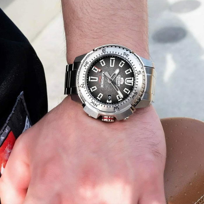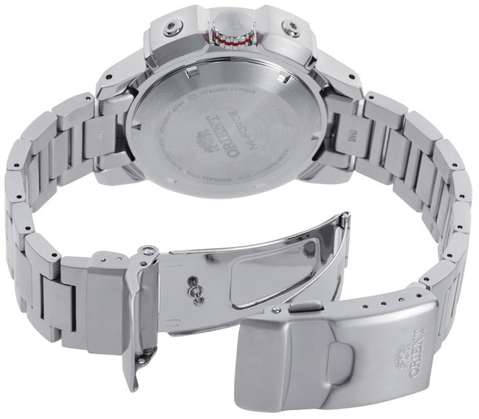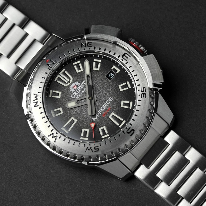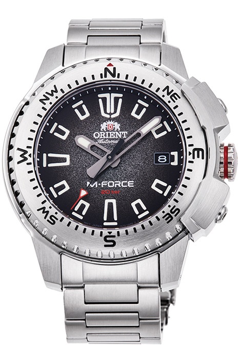 Механические часы с автоподзаводом. В механизме 22 камня. Запас хода на 40 часов. Водостойкость WR 200. Центральные часовая, минутная и секундная стрелки. Функция stop-second. Индикация даты на позиции трех часов. Вращающийся безель выполняет функцию компаса. Стрелки и метки с люминесцентным покрытием. Черный циферблат с часовыми индексами в виде штрихов. Корпус выполнен из нержавеющей стали. Диаметр корпуса 47 мм. Устойчивое к возникновению мелких механических повреждений сапфировое стекло с антибликовым покрытием. Заводная головка с защитой. Браслет выполнен из нержавеющей стали.
