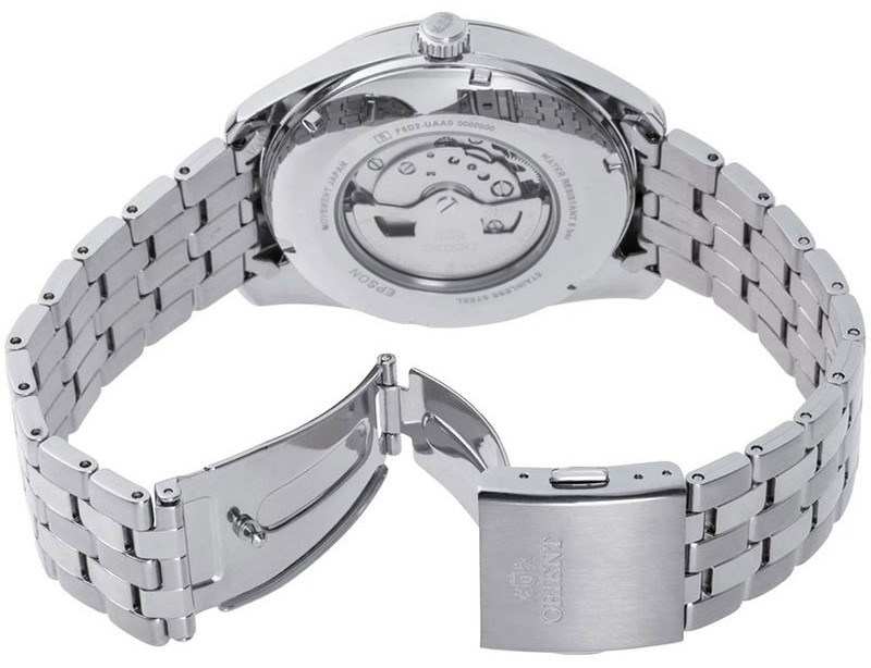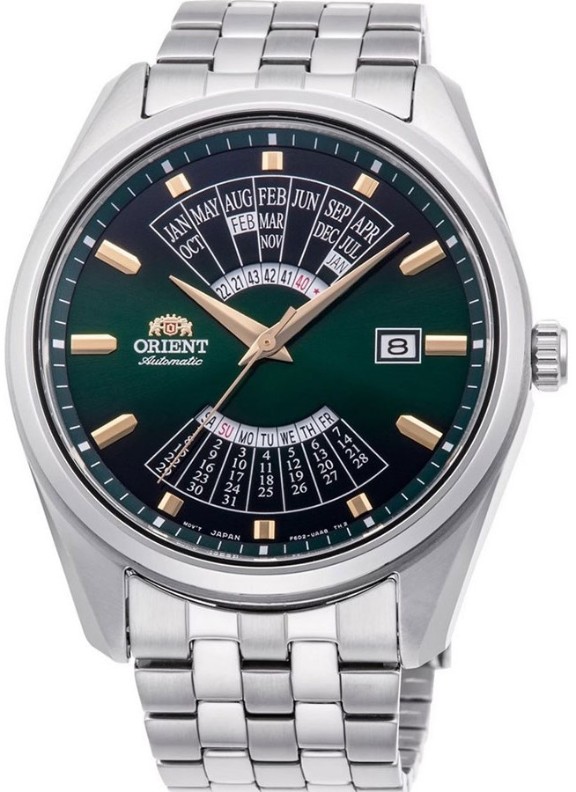 Мужские механические часы с автоподзаводом. Запас хода 40 часов. Центральные часовая, минутная и секундная стрелки. Мульти-календарь: дата, день недели, месяц, год. Зеленый циферблат. Круглый корпус выполнен из нержавеющей стали. Диаметр корпуса составляет 43,5 мм. Стальной браслет, раскладывающаяся застежка. Прочное минеральное стекло устойчивое к мелким механическим повреждениям. Прозрачная задняя крышка. Водостойкость WR 50 (мытье рук, дождь).