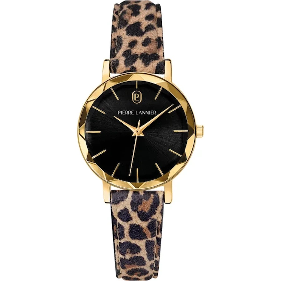 Женские кварцевые часы. Центральные часовая, минутная и секундная стрелки. Черный циферблат. Круглый корпус выполнен из нержавеющей стали с IP покрытием цвета желтого золота. Диаметр корпуса составляет 30 мм, толщина 7,3 мм. Леопардовый кожаный ремешок (нубук) шириной 14 мм, стандартная застежка. Прочное минеральное стекло устойчивое к мелким механическим повреждениям. Водостойкость WR 50 (мытье рук, дождь).