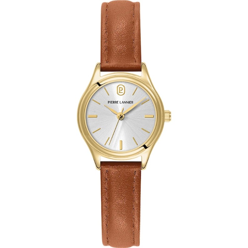 Женские кварцевые часы. Центральные часовая, минутная и секундная стрелки. Серебристый циферблат. Круглый корпус выполнен из нержавеющей стали 316L с PVD покрытием цвета желтого золота. Диаметр корпуса составляет 26 мм, толщина 7,4 мм. Коричневый кожаный ремешок шириной 12 мм, стандартная застежка. Прочное минеральное стекло устойчивое к мелким механическим повреждениям. Водостойкость WR 50 (мытье рук, дождь).