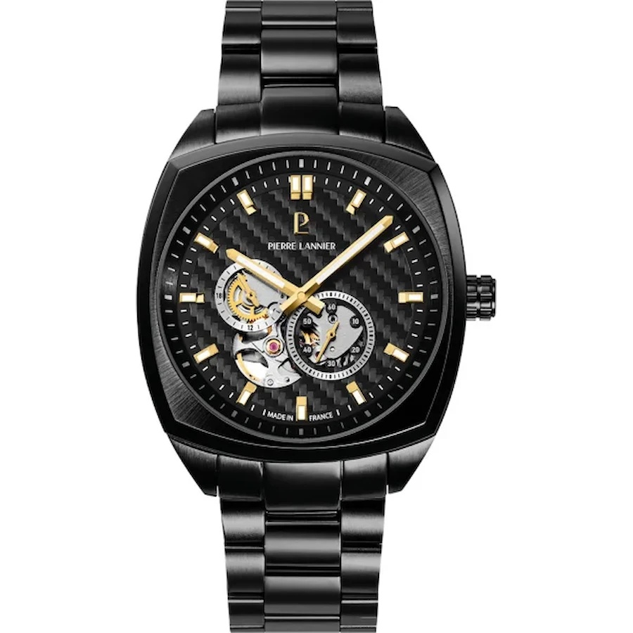 Мужские механические часы с автоподзаводом. Центральные часовая и минутная стрелки, малая секундная стрелка. 12/24-часовой формат времени. Черный циферблат с открытым балансом хода. Люминесцентные стрелки и метки. Корпус выполнен из нержавеющей стали с черным PVD покрытием. Диаметр корпуса составляет 42,5 мм, толщина 11,6 мм. Стальной браслет с покрытием, раскладывающаяся застежка. Прочное минеральное стекло устойчивое к мелким механическим повреждениям. Водостойкость WR 50 (мытье рук, дождь).