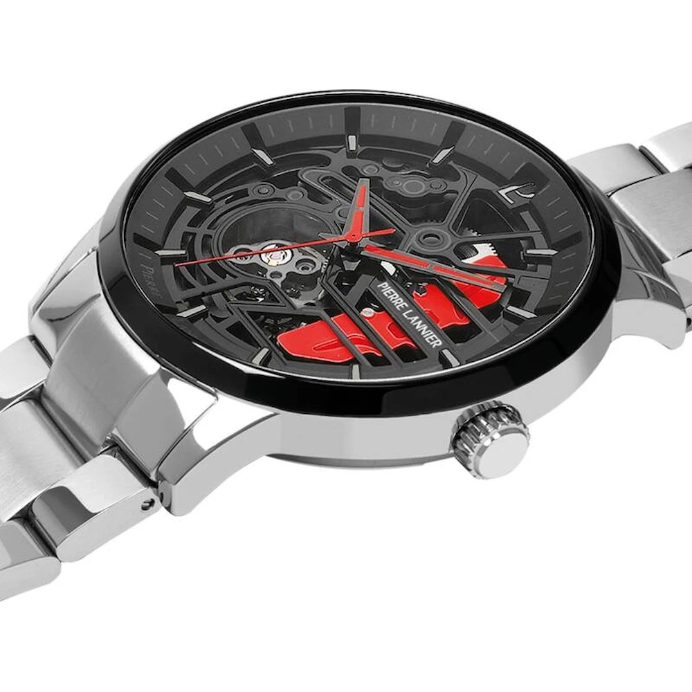 Мужские механические часы с автоподзаводом. Центральные часовая, минутная и секундная стрелки. Черный скелетонизированный циферблат. Круглый корпус выполнен из нержавеющей стали. Диаметр корпуса составляет 43 мм, толщина 12,3 мм. Стальной браслет, раскладывающаяся застежка. Прочное минеральное стекло устойчивое к мелким механическим повреждениям. Водостойкость WR 50 (мытье рук, дождь).