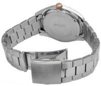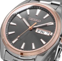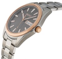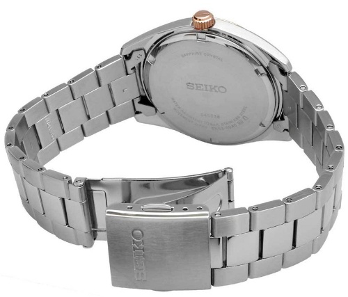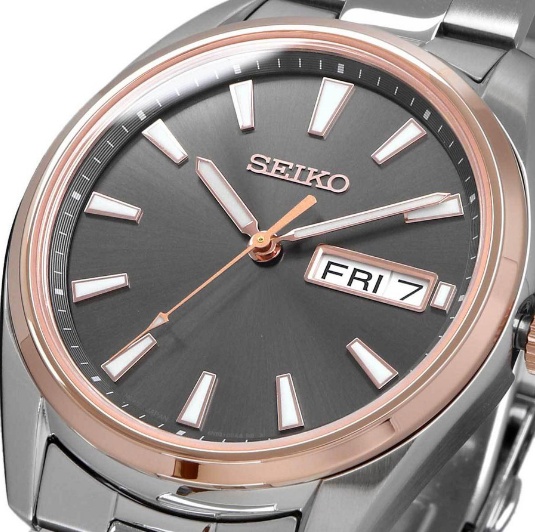 Мужские кварцевые часы. Калибр механизма 6N53. Центральные часовая, минутная и секундная стрелки. Апертура даты и дня недели в позиции 3 часов. Черный циферблат. Люминесцентные стрелки и метки. Круглый корпус выполнен из полированной нержавеющей стали с частичным PVD покрытием цвета розового золота по безелю. Диаметр корпуса составляет 40 мм. Стальной браслет, раскладывающаяся застежка. Устойчивое к возникновению царапин сапфировое стекло. Водостойкость WR 100 (плавание без погружения).