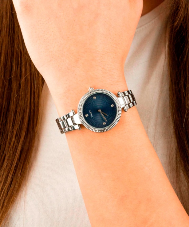 Стильно дизайнерское исполнение этих элегантных часов, благотворно влияет на творческий потенциал. Начните поиск новых впечатлений. Наручные женские часы. Круглый корпус c рифленым безелем в технике ’’clous de Paris’’. Текстурированный циферблат с метками в виде точек, украшенных кристаллами. Стальной браслет с раскладывающейся застежкой.