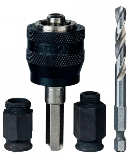 Адаптер POWER CHANGE BOSCH 2608599010 предназначен для закрепления коронок Progressor в патрон инструмента. Адаптер оснащен шестигранным хвостовиком диаметром 9.5 мм. В комплекте центрирующее сверло длиной 80 мм с шестигранным хвостовиком размером 1/4", а также два переходника для закрепления коронок различного диаметра.
