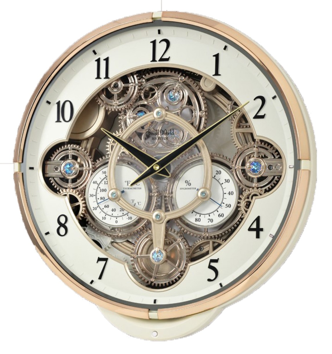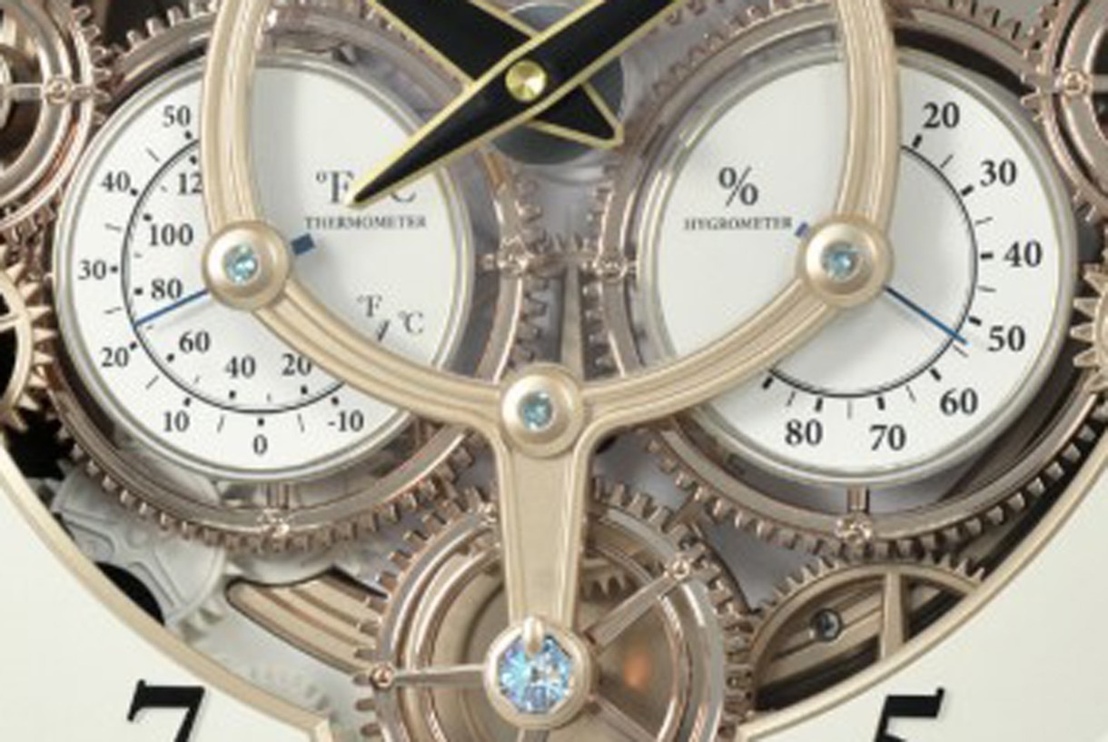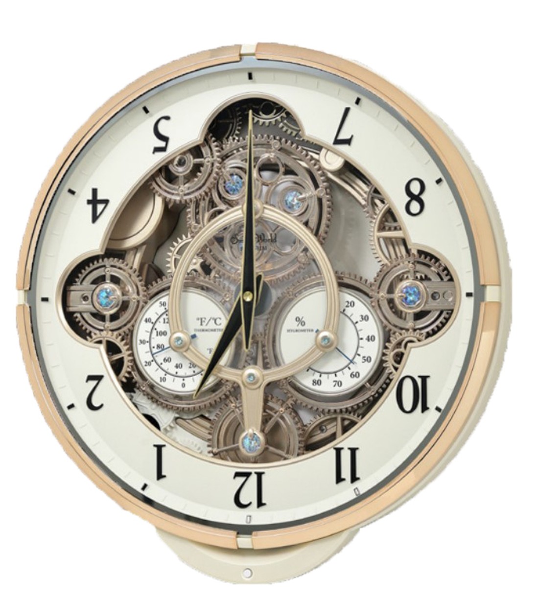 Часы напомнят вам о некоторых великих часах прошлого. В час шестеренки совершают ход, а циферблат совершает полный оборот, играя одну из 30 мелодий. Они считывают температуру, влажность и показывают время. Красиво оформленный с непрерывно вращающейся шестерней внизу и 6 кристаллами. Часы работают от кварцевой батарейки.