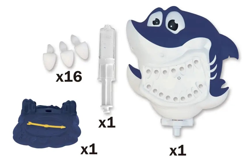 Настольная игра Брызгающая Акула - новинка . В неё входит фигурка Акулы, подставка, мелкие предметы, весь набор упакован в коробку. Суть игры - доставать из пасти морского жителя зубы. Если сделать это неаккуратно, то Акула выпустит струю воды. Игра развивает внимание, мелкую моторику и логическое мышление.