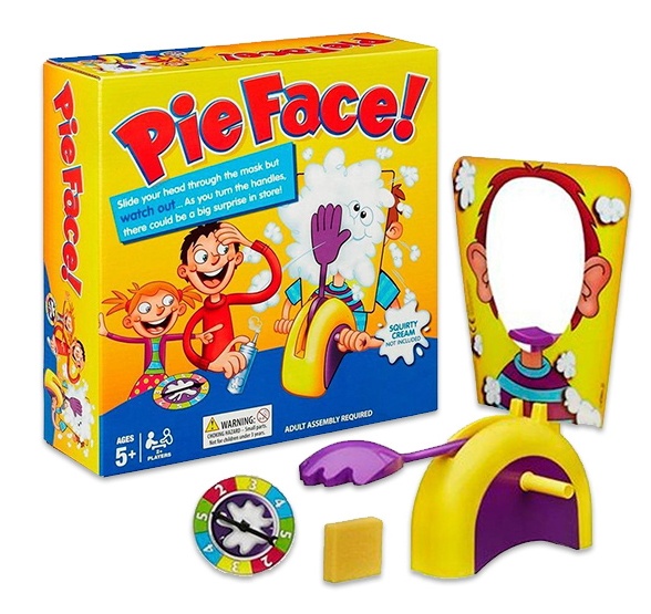 Pie Face представляет собой небольшую пусковую катапульту, которая готова забросать тортом "Счастливчика". Эффект неожиданности обеспечивает острые ощущения. По правилам игроки по очереди крутят рулетку с цифрами и сразу примеряют маску с отверстием под лицо. Дальше крутят ручки пускового механизма и ждут, как бы катапульта помиловала их и выстрелила в кого-то другого. Зрелище очень смешное и интригующее. Поэтому попробовав забаву Pie Face, будьте уверены, что отличное настроение и море смеха обеспечено.