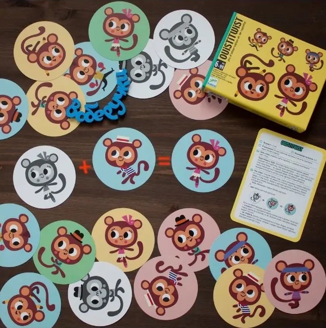 Процесс игры: Получив право хода, игрок открывает первую карточку из стопки и кладет ее рядом со стопкой черно-белой стороной вверх, чтобы черно-белая и цветная карточка оказались рядом. Затем все игроки одновременно стараются найти карточку, на которой есть: - поза обезьянки с черно-белой карточки и - цвет фона цветной карточки. Если соответствующая карточка: - открыта (т.е. находится сверху стопки или в центре стола или перед одним из игроков), то ее получит игрок, который первым ударит по ней; - не открыта, значит, она находится в стопке! Игрок, который первым ударит по стопке, получит первую черно-белую карточку, лежащую в центре стола. Игрок, заработавший карточку, кладет ее перед собой цветной стороной вверх. Партия заканчивается, когда один из игроков набрал нужное количество карточек.