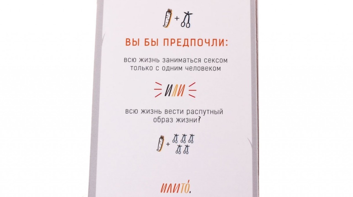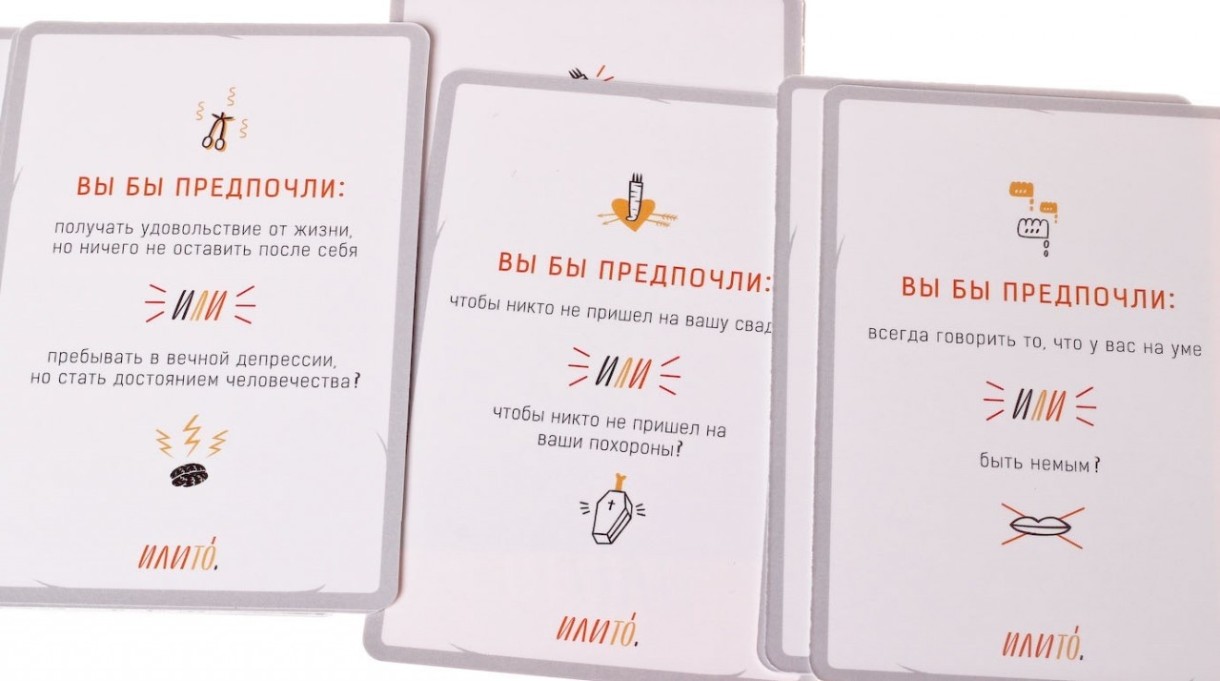 Коробка с ИлиТо вместила в себя не просто 60 карт, она вместила в себя 60 неразрешимых конфликтов, каждый из которых был бы способен сравнять с землей Трою за считанные минуты. Например, чтобы вы выбрали: знать точную дату своей смерти или обстоятельства своей смерти? Или что вам милее: всегда говорить все, что у вас на уме, или быть немым? Компромиссов быть не может — принимайте решение так, как будто сразу же, после того, как вы топнете ногой и огласите свое «заднее слово», то, что вы выбрали, тут же и произойдет. Страшно? Еще как!
