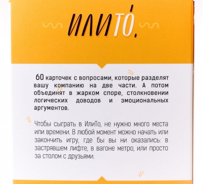Компактная, качественная, прекрасно оформленная и невероятно увлекательная игра ИлиТо — это 60 уникальных и остроумных способов собрать за столом всех своих друзей и... посоревноваться в убедительности.