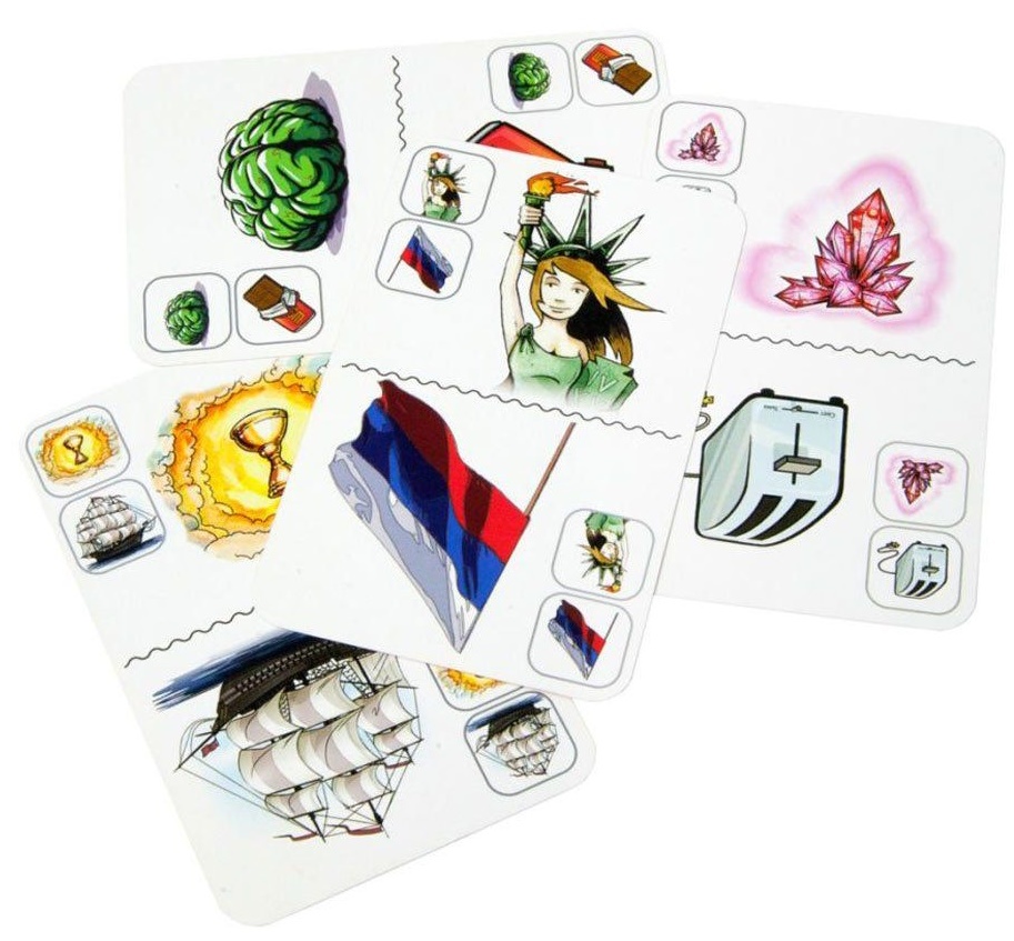 Быстрая зажигательная игра, участники которой наперегонки избавляются от карт на руках. Вы можете скинуть карту, если одна из двух её картинок совпадает с картинкой на карте, лежащей на столе. В этой лихорадочной карточной куче-мале побеждает самый быстрый и самый удачливый игрок!