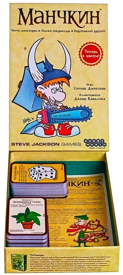 Итак, настольная игра "Манчкин" – это ролевая игра по форме, пародия по содержанию. Манчкины игроков ходят по подземелью, вытаскивают на свет божий тамошних чудовищных обитателей и либо раскаиваются в этом, либо получают за победу новые уровни и сокровища. Исход каждого подобного приключения (боя, короче) зависит от того, кто с чем на бой вышел. У игрока это уровень и бонусы/штрафы от шмоток, класса, расы и проклятий. У монстра это уровень плюс карты-усилители и разовые шмотки. Откуда шмотки у монстра? В Вашем бою могут принять участие и завистливые соперники: они могут помогать монстру и ослаблять вас. Поэтому, хотя в "Манчкин" и можно играть вдвоём, наберите на матч побольше народу: на руках будет больше проклятий, усилителей и зелий, которыми так легко изменить баланс сил в бою в любую сторону, и бдительные завистники не дадут никому из Вас выйти в единоличные лидеры гонки к 10-му победному уровню.