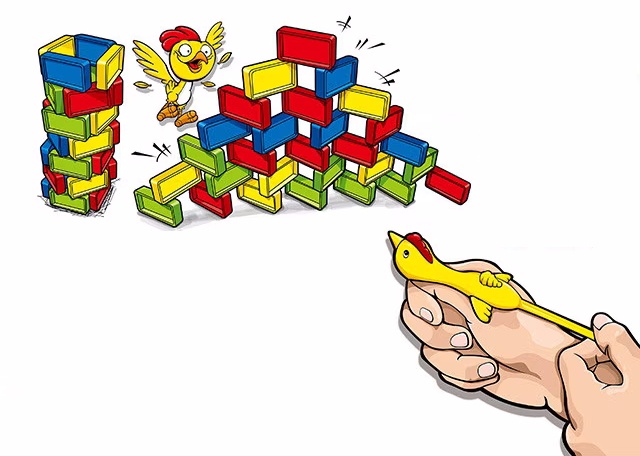 Спортивно развлекательная игра развивает ловкость и меткость стрельбы заключается в метании силиконовых цыплят в конструкцию из блоков.