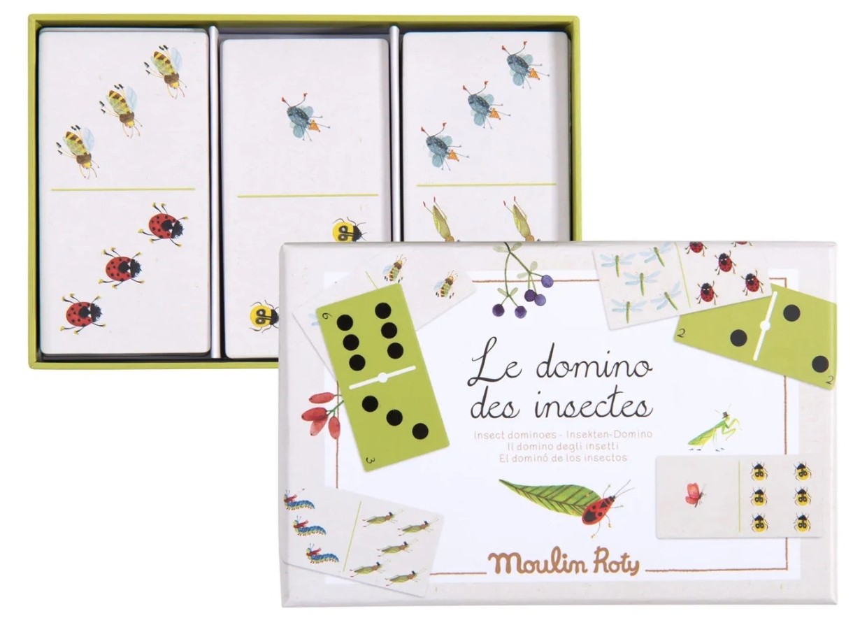И дети, и взрослые проведут часы веселья, изучая разных насекомых, называя их и сопоставляя картинки с игрой в домино Le Jardin «Насекомые». Двусторонняя игра имеет индивидуально разработанные крошечные милые иллюстрации различных насекомых на одной стороне и классические черные точки домино на другой. В этой игре из 28 деталей представлены бабочки, пчелы, гусеницы и стрекозы, помещенные в прочную коробку. Домино отлично подходит для обучения счету, а также для развития памяти и моторики.