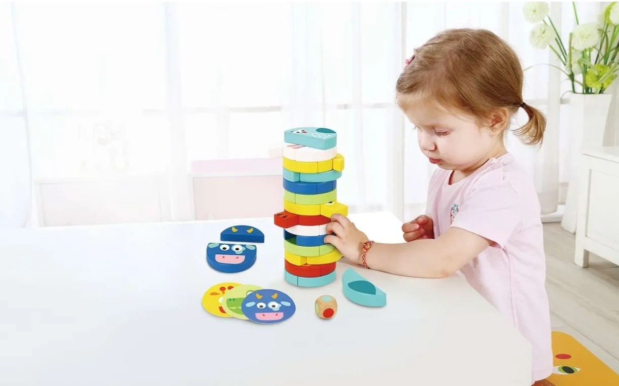 Эта веселая игра - аналог знаменитой Дженги, станет фаворитом всей семьи. Игра-баланс с деревянными брусочками. Чтобы начать игру, необходимо построить башню из деревянных брусков, собрав по картинкам изображена животных. Затем игроки поочередно совершают ходы и вытаскивают из башни бруски до тех пор, пока башня не рухнет. Ходы можно совершать кидая кубик или наугад вытаскивая карточки с изображениями животных. Игра помогает интуитивно ознакомится с понятиями веса, баланса, равновесия и сноровки. Игра подходит для 2 и более игроков. Это прекрасный выбор для игры с друзьями и в кругу семьи, что способствует развитию взаимодействия и укреплению связи между детьми и родителями. Игра изготовлена из высококачественного дерева, покрыта нетоксичной краской на водной основе и совершенно безопасна для малышей.