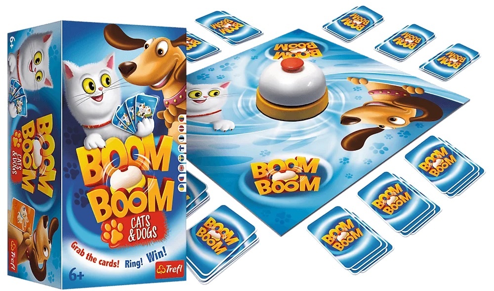 В Boom Boom Cats & Dogs игроки пытаются собрать наборы карточек с кошками или собаками. Игроки одновременно обмениваются своими картами с картами на доске. Поймав четырех одинаковых собак или кошек, игрок звонит в колокольчик, сигнализируя о готовности набора. Игроки могут охотиться за картами одного типа, что делает игровой процесс еще более захватывающим. Игрок, который соберет полные наборы карточек с собаками или кошками, становится победителем!