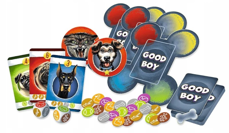 Комплектация60 призовых фишек, 3 садовые доски, 28 карточек с собаками, 2 призовых кубика, 4 будки для собак/кошек, игровое поле