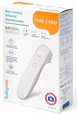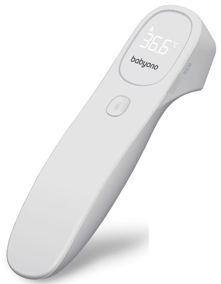 Бесконтактный термометр Babyono быстро и точно мерит температуру. С помощью одной кнопки Вы можете получить точное измерение за 1 секунду. Он безопаснее и удобнее в использовании, чем традиционные термометры для рта, наручные или для уха. Термометр мерит также температуру предметов, пищи, жидкостей и окружающей среды. Тихая и уникальная вибрационная сигнализация позволяет измерять температуру, пока ребенок спит. Стильный светодиодный экран с подсветкой позволяет легко считывать температуру даже ночью. Медицинское устройство, прошедшее клинические испытания в ЕС.