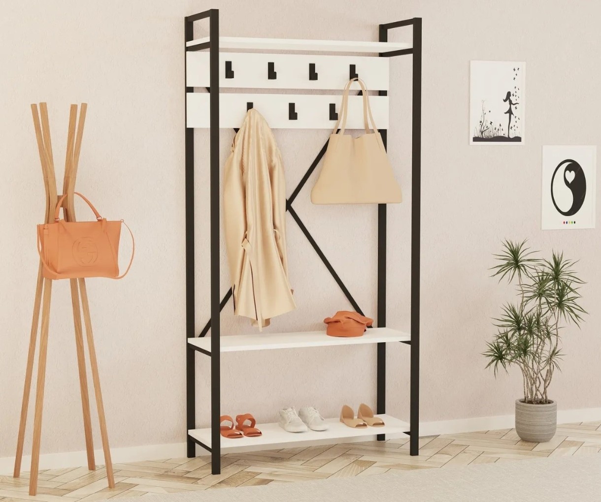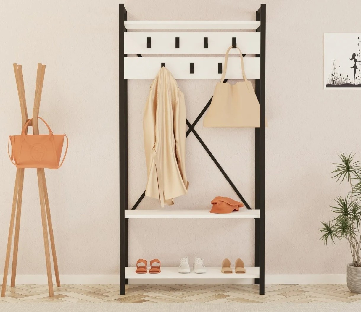 Стойка не только предлагает много места для хранения, но и оснащена многофункциональной вешалкой. На неё удобно повесить одежду, шляпы и шарфы, получая быстрый доступ к нужным вещам. Дополнительно конструкцию можно закрепить на стене, освобождая пространство на полу.