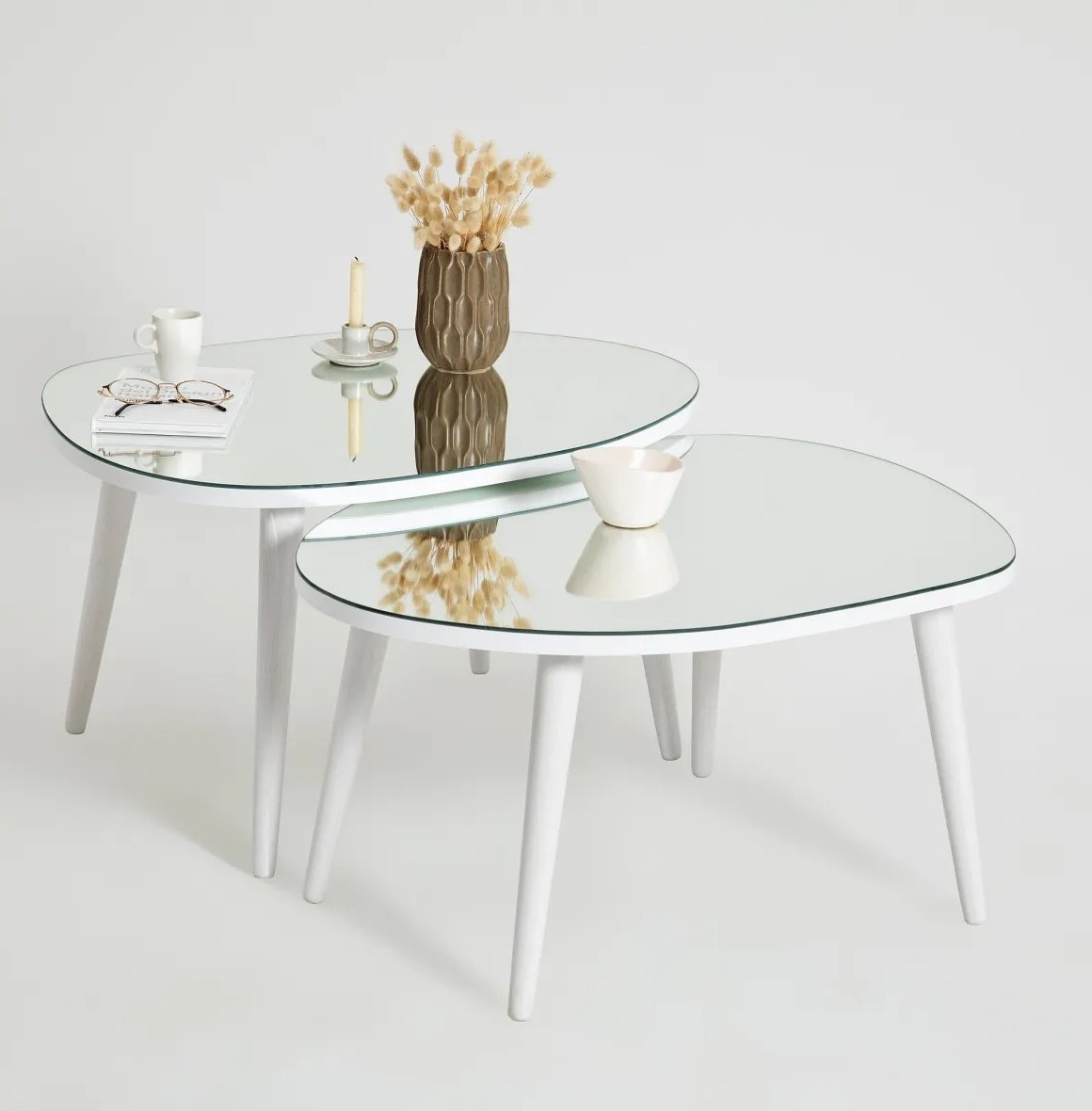 Независимо от того, принимаете ли вы гостей или просто отдыхаете дома, эти столики-матрешки предлагают удобное решение. Два элемента можно использовать по отдельности или размещать один под другим, чтобы экономить пространство. Компактные размеры делают набор подходящим для небольших квартир, студий и любых помещений, где важно рационально использовать пространство.