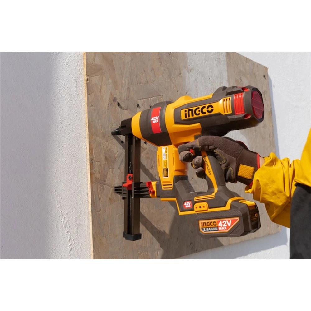 Аккумуляторный степлер INGCO CCNLI420602 оснащён бесщеточным мотором (brushless) для высокой производительности и долговечности при профессиональном использовании. Работает от 42V и принимает гвозди длиной от 19 до 40 мм (3/4'' – 1-5/8''), идеально подходит для крепления кабелей и труб на бетон C60 и сталь 6 мм (максимальная длина гвоздя 27 мм).